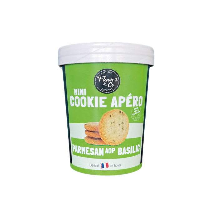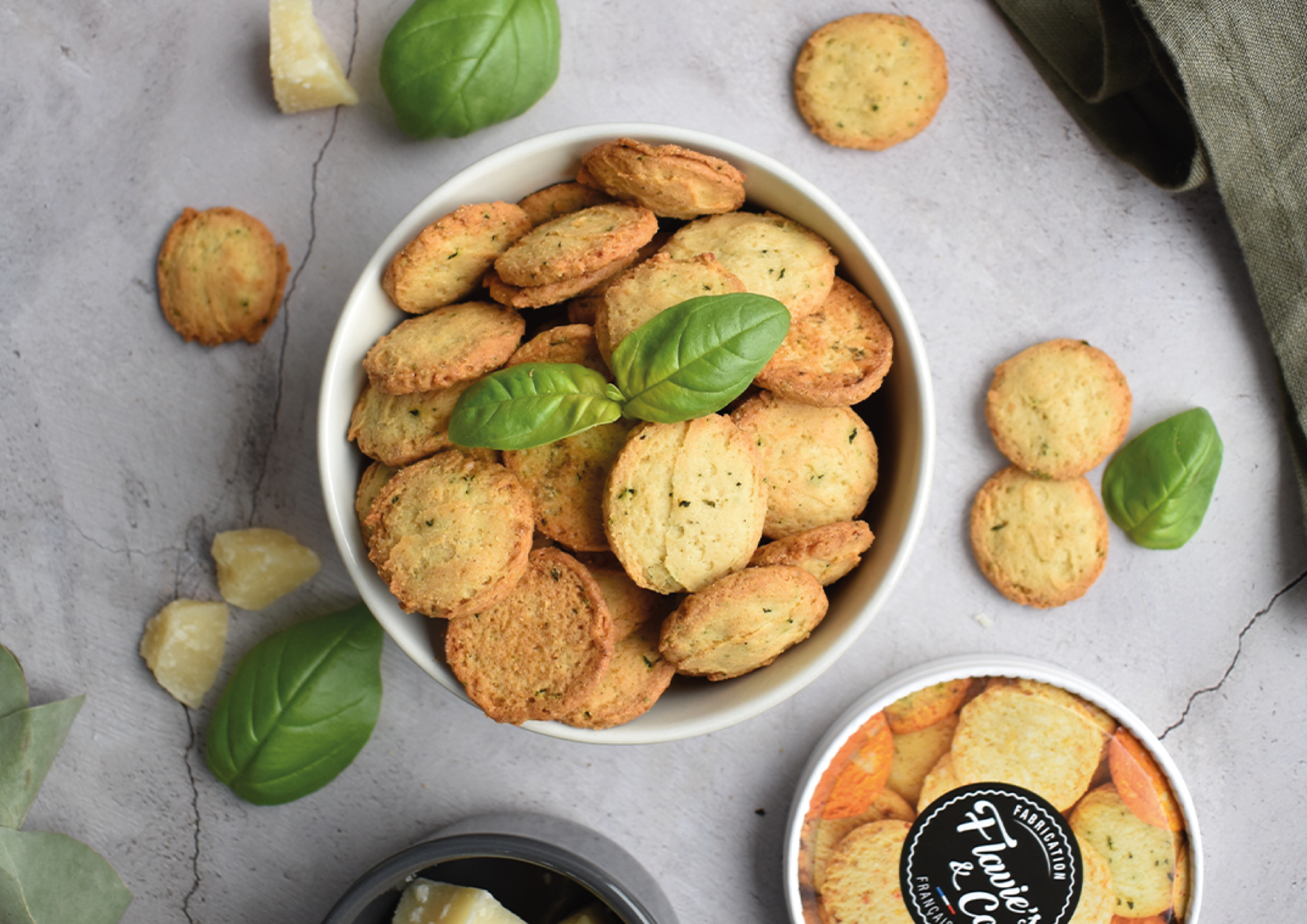 Vous aimez le fromage ? Alors laissez-vous porter par l’élégance de ce mini cookie salé au Parmesan A.O.P. (Parmigiano Reggiano) et basilic signé Flavie’s & Co. Des origines italiennes, un savoir-faire français — le meilleur des deux mondes dans un seul petit biscuit croustillant et généreux.