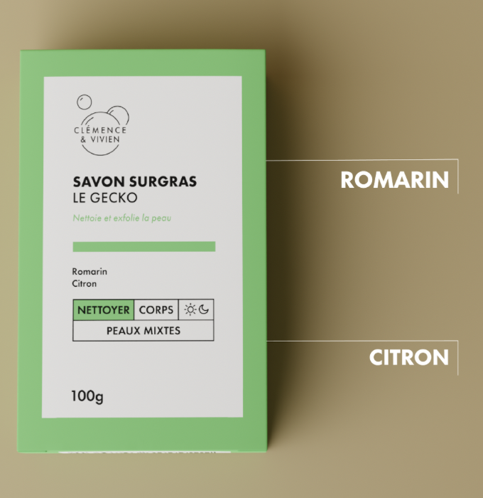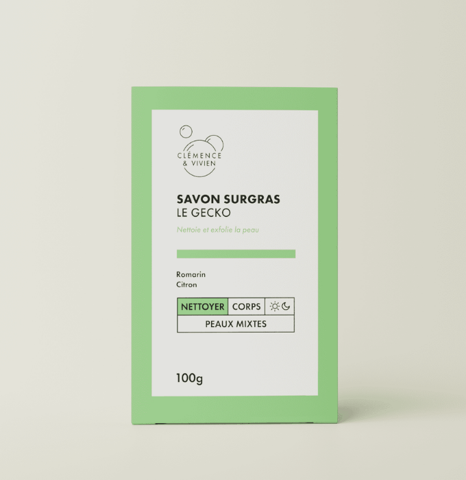 Le Savon à Froid Le Gecko Clémence & Vivien est un savon purifiant et exfoliant, idéal pour celles et ceux qui recherchent un gommage doux intégré à leur routine quotidienne.